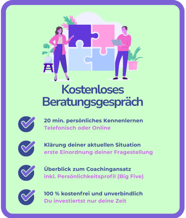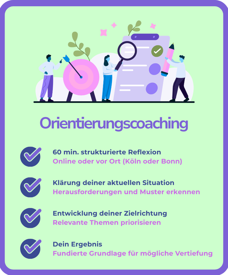 Nutze eine erste Coaching-Session, um deine aktuelle Situation strukturiert zu reflektieren. Gemeinsam arbeiten wir heraus, welches Thema für dich im Fokus stehen sollte und wo gezielte Veränderung ansetzen kann.